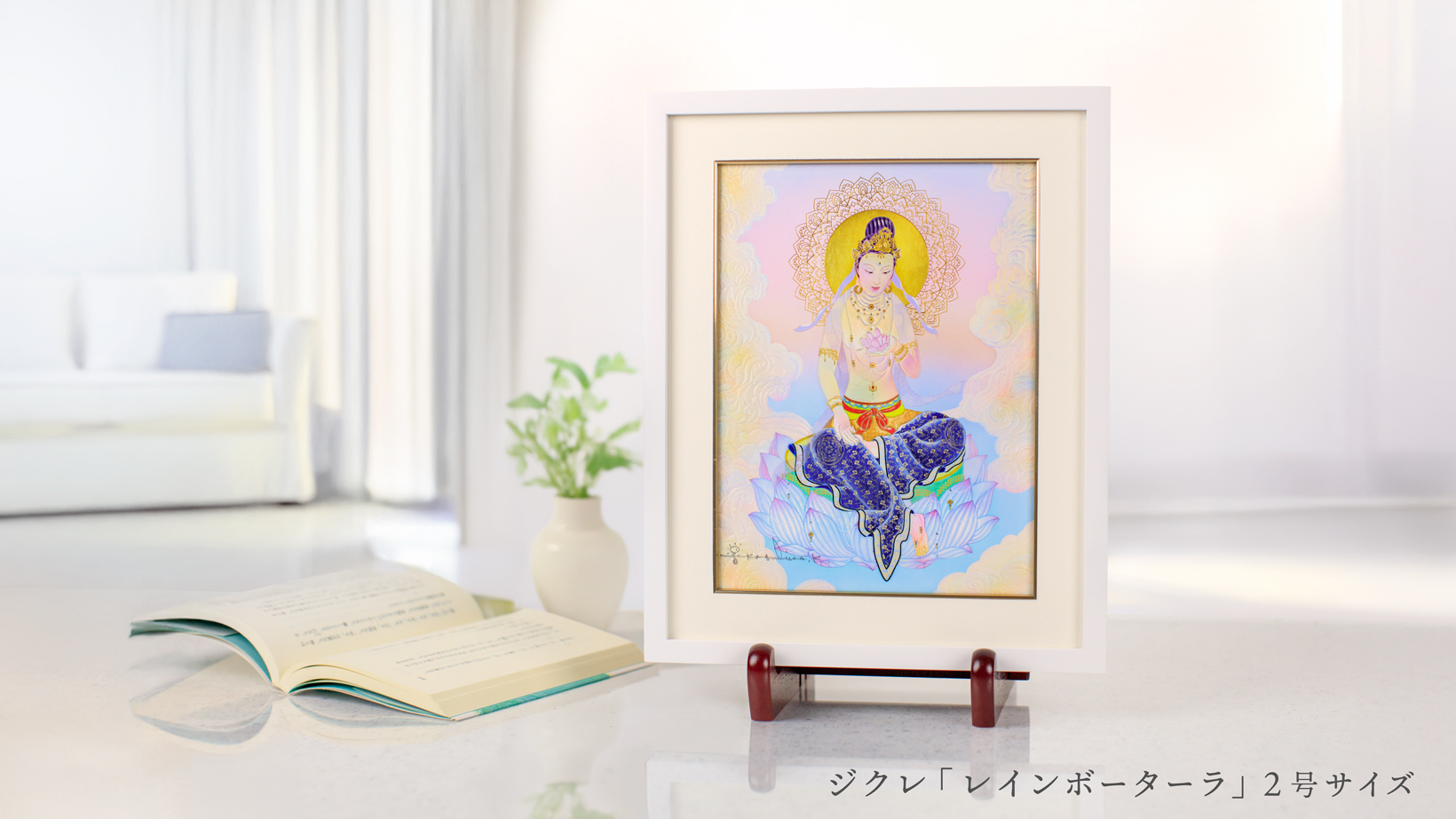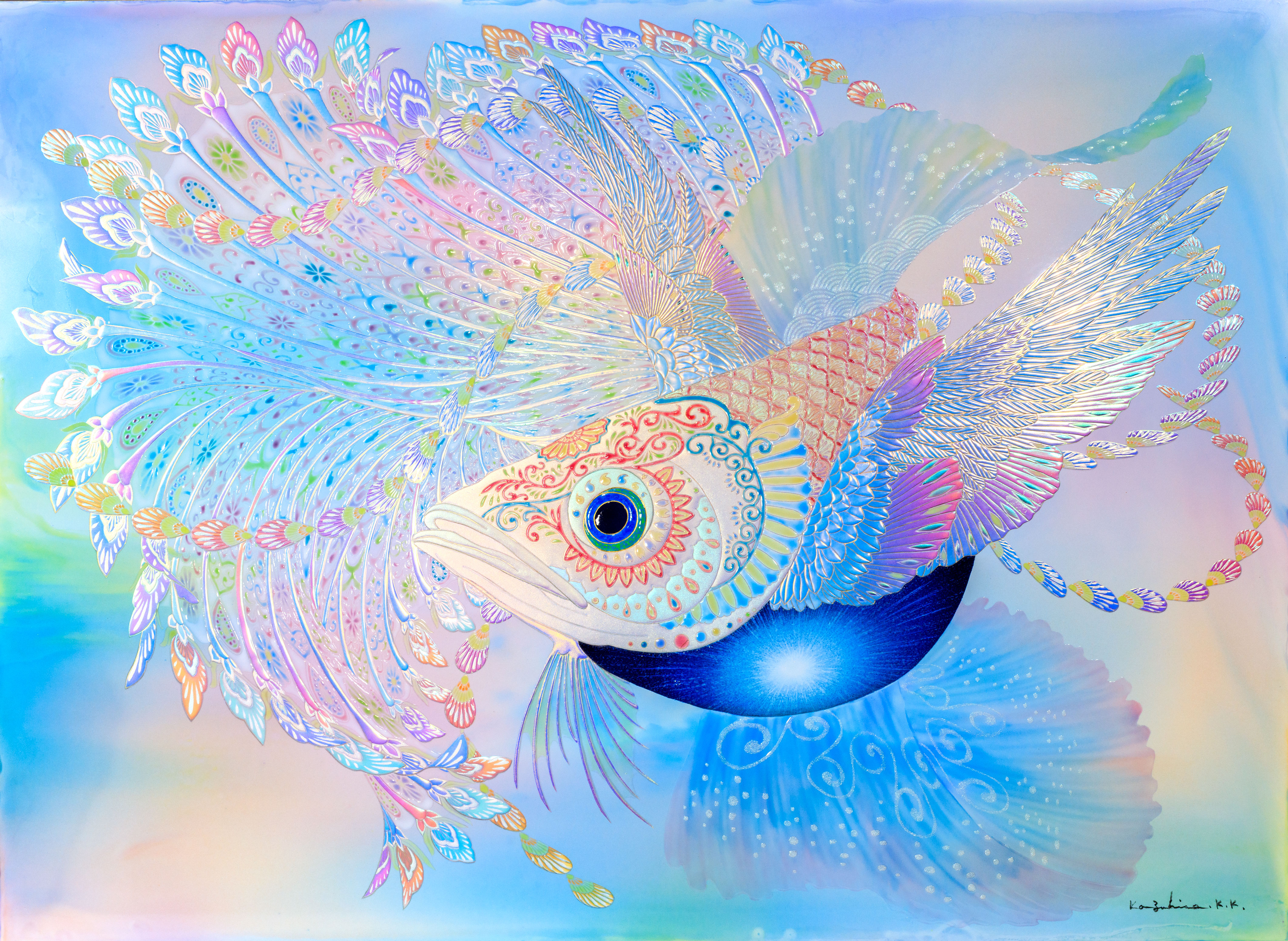 古代の伝承に語られる『鯤(こん)』は、北冥に潜み、やがて大いなる鳥へと姿を変える存在。その変容の物語に重ね、無限の可能性と生命の躍動が表現されており、『レインボーターラ』は、あらゆる感情や体験を包み込み、調和の象徴である虹の光へと昇華させる菩薩として描かれました。その輝きは、私たちの内なる太陽を呼び覚まし、新たな希望を心に灯します。