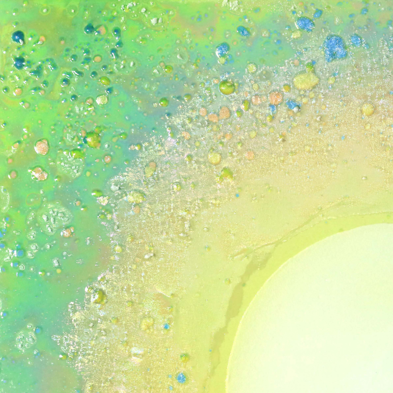 この素材を用いて作った「如意宝珠」は、明るい部屋では鮮やかな色彩の作品ですが、