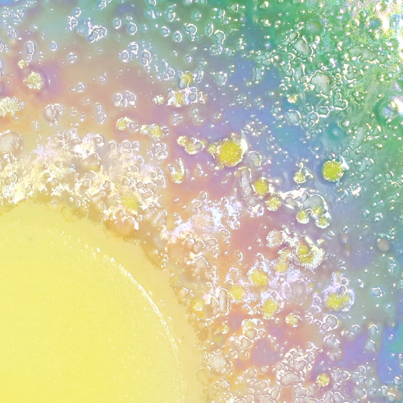 この素材を用いて作った「如意宝珠」は、明るい部屋では鮮やかな色彩の作品ですが、